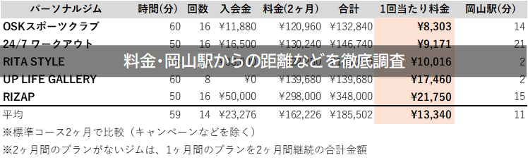 岡山で評判のいいパーソナルトレーニングジムを『標準コース・2ヶ月』で調査したところ、以下のような結果になりました。